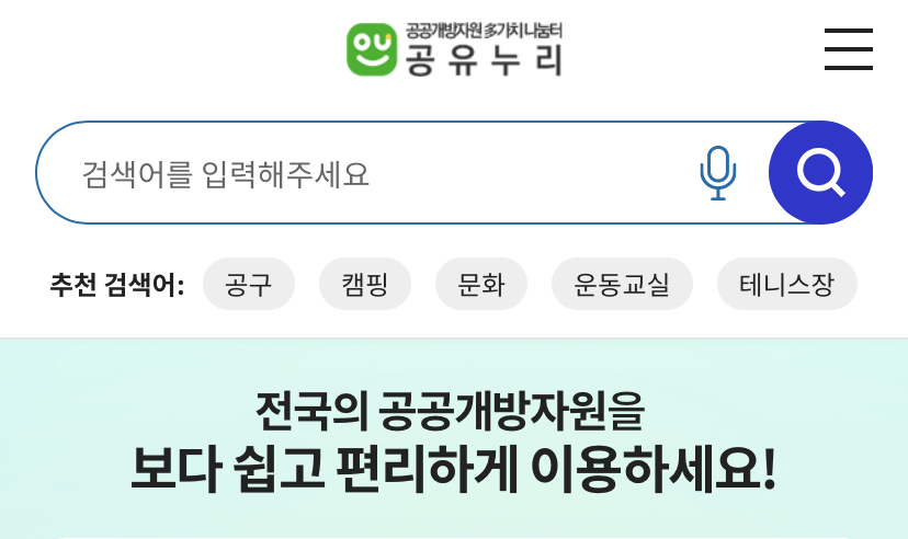 ‘공유누리’는 중앙행정기관, 지방자치단체, 공공기관 등 공공부문에서 국민에게 개방하는 시설, 물품 등 공공개방자원을 국민이 온라인에서 쉽고 편리하게 검색하고 예약하는 대국민 공공개방자원 공유서비스 포털입니다.