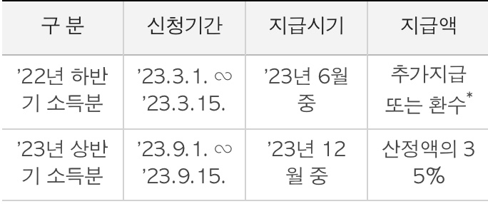 장려금 산정액의 35%를 반기별로 지급하고, 소득귀속연도 다음 연도 5월에 정기 신청했을 경우의 지급액과 비교하여 정산합니다.