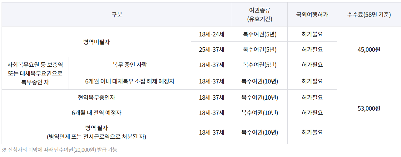 - 6개월 내 대체복무 소집해제 예정자가 복무확인서 등 소집해제 예정일이 명시된 서류를 제출하는 경우 10년 복수여권 발급
