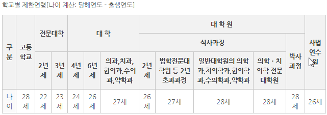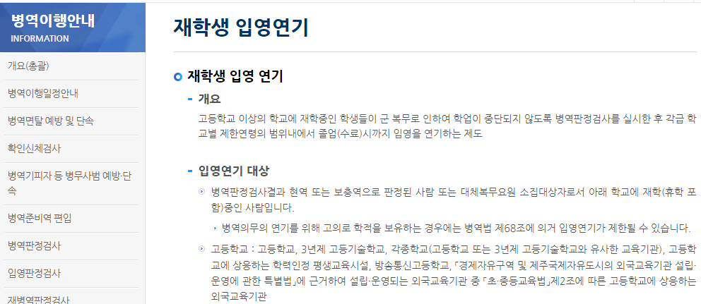 위 표에 따르면, 입영연기는 2년제 대학 22세, 4년제 대학 24세, 6년제 대학과 대학원 26세, 의치대 및 대학원(4학기 초과) 28세까지 가능합니다.