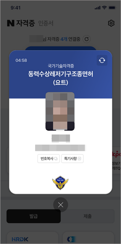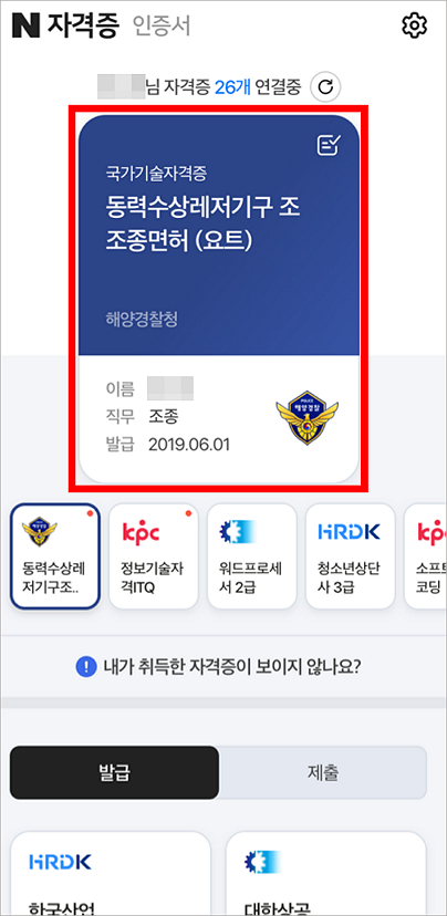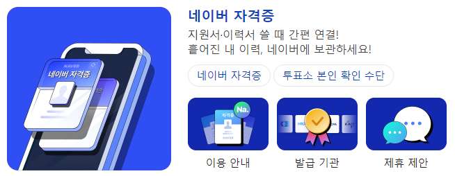 네이버 인증서를 통해 발급기관의 자격증 정보를 네이버앱에서 확인할 수 있습니다.