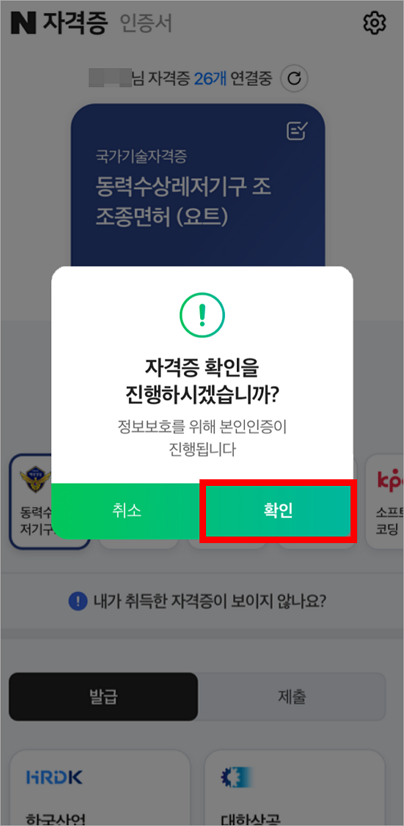 2. 자격증 확인 안내 메시지에서 확인을 누릅니다.