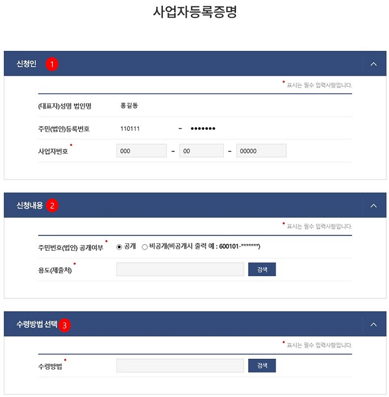 ① 사업자구분과 성명은 로그인 구분에 따라 자동 설정