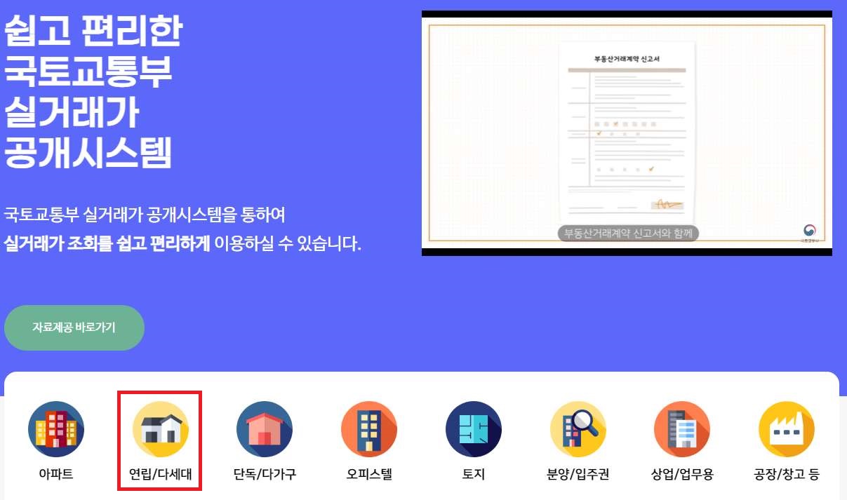 국토부 실거래가 공개시스템에서 연립/ 다세대 버튼을 클릭하시면 됩니다.