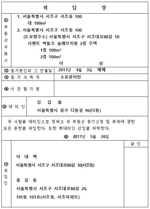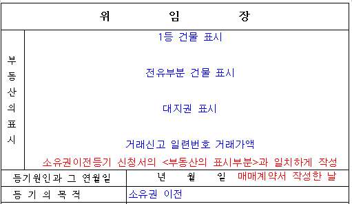 위임하고자 하는 등기신청인의 성명과 주소를 기재하고 날인합니다. 등기의무자의 인감증명서를 첨부해야 하는 등기인 경우에는 그의 인감을 날인하여야 합니다.
