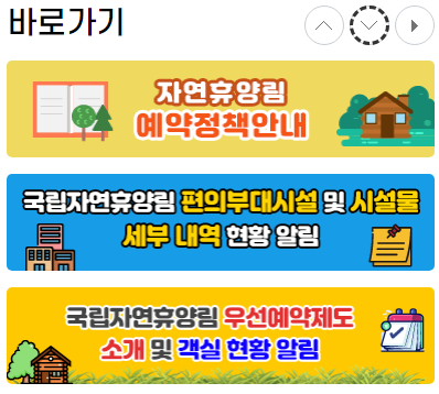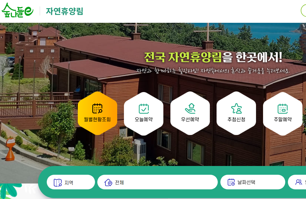 * 국립자연휴양림에서는 장애인/실버(65세 이상)/다자녀가정/산림복지서비스 이용권(바우처카드) 대상자/아세안 회원국 고객님들을 위한 우선예약 제도를 운영하고 있으니 많은 이용 부탁드립니다.