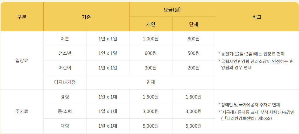 ※ 자연휴양림 시설이용료에 대한 자세한 정보는 숲나들e 홈페이지의 ▶자연휴양림 시설사용료 확인하기◀ 메뉴에서 확인 가능합니다.