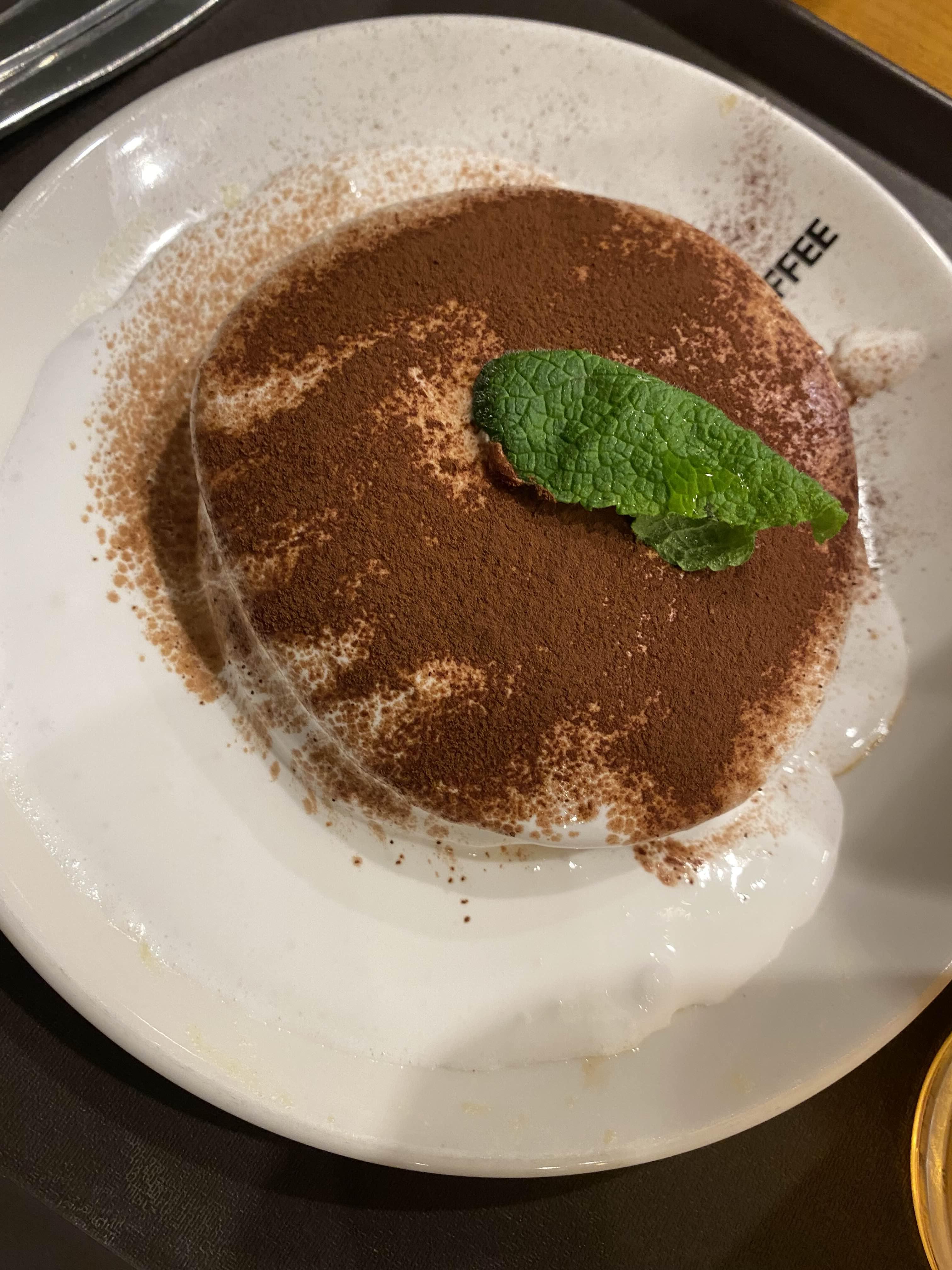 에스프레소 향이 느껴지는 달콤한 팬케이크에 크리미한 크림이 가득 올라간 부드러운 티라미수 팬케이크는