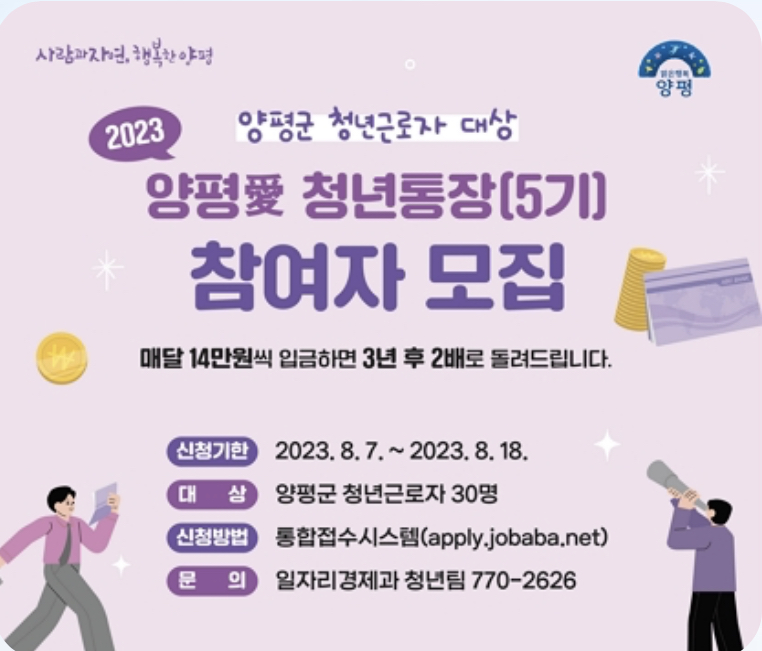 양평애 청년통장 대상과 신청 방법을 알아봅시다. 양평군은 2023년 양평愛 청년통장(5기) 참여자를 7일부터 모집합니다. 청년통장은 중소기업에 취업촉진과 장기근속을 지원하기 위해 근로지원금을 지급하는 프로그램입니다.