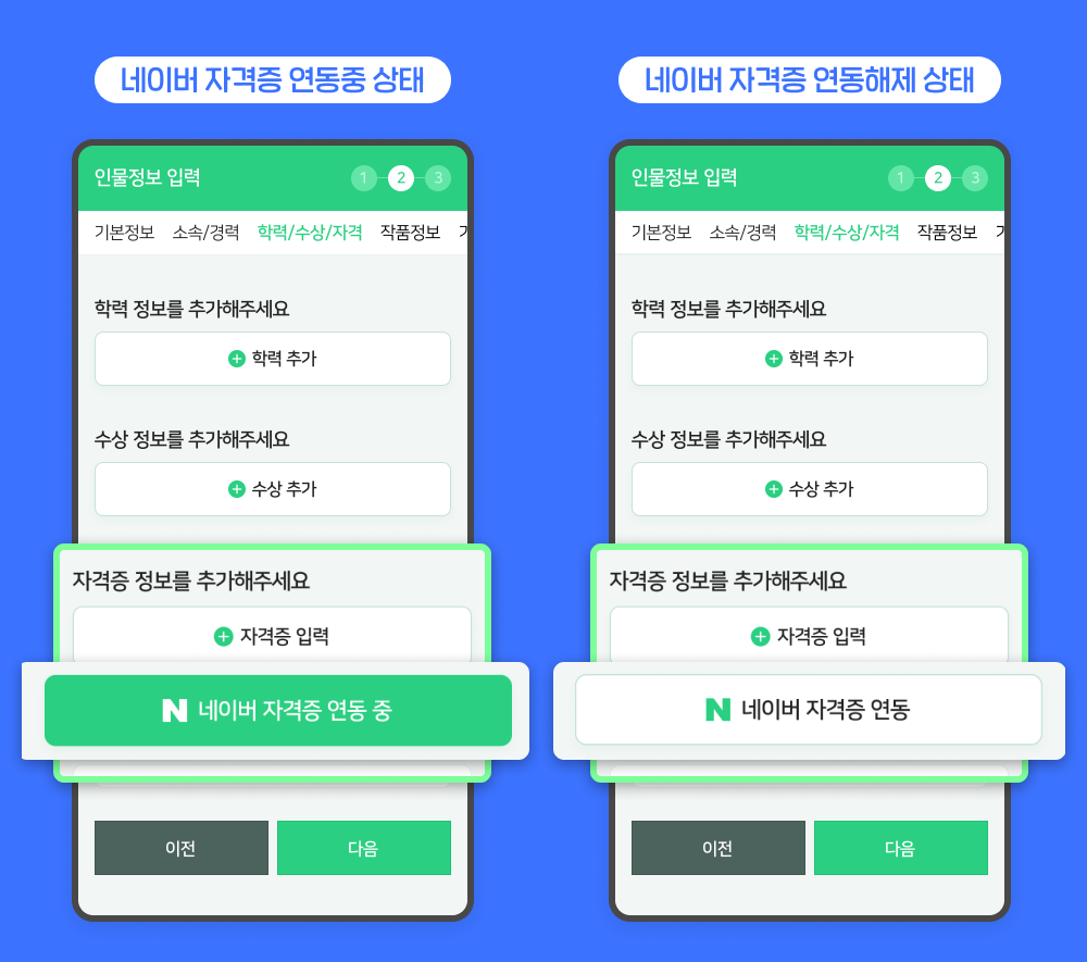아래 제출처에서 이력서 작성 시, 네이버 자격증 서비스에 연동해둔 자격증/어학성적을 간편하게 불러와 자동 입력할 수 있습니다.